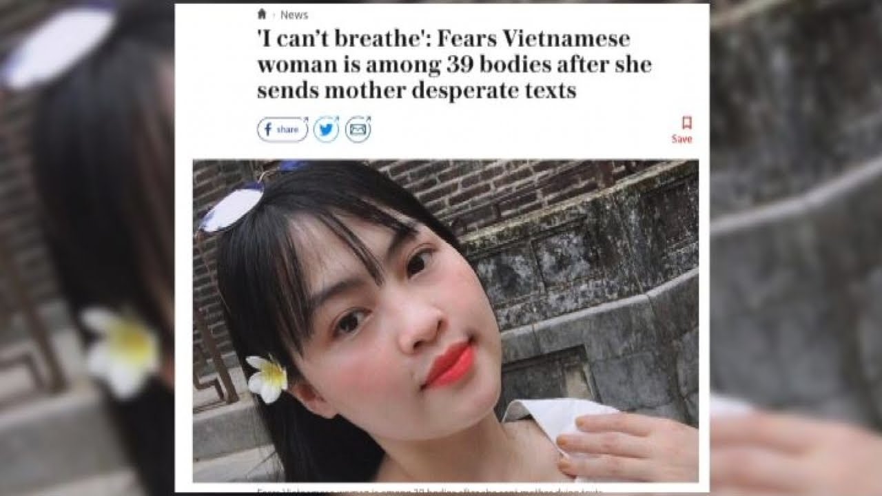 Dopo 48 ore dalla terribile tragedia continua l’identificazione dei 39 migranti trovati morti soffocati in un camion frigorifero in Essex, in Gran Bretagna. Tra di loro, inizialmente identificati come tutti cittadini cinesi, ci sarebbero anche alcuni vietnamiti; e forse anche una ragazza di 26 anni, Pham Thi Tra My. La madre della giovane ha ricevuto alcuni drammatici sms che dicevano “Sto morendo, non riesco a respirare, perdonami, ti voglio tanto bene”. La famiglia conferma che la ragazza stava tentando di entrare in Gran Bretagna e che non ha sue notizie da due giorni. Ha chiesto aiuto a una organizzazione umanitaria vietnamita.