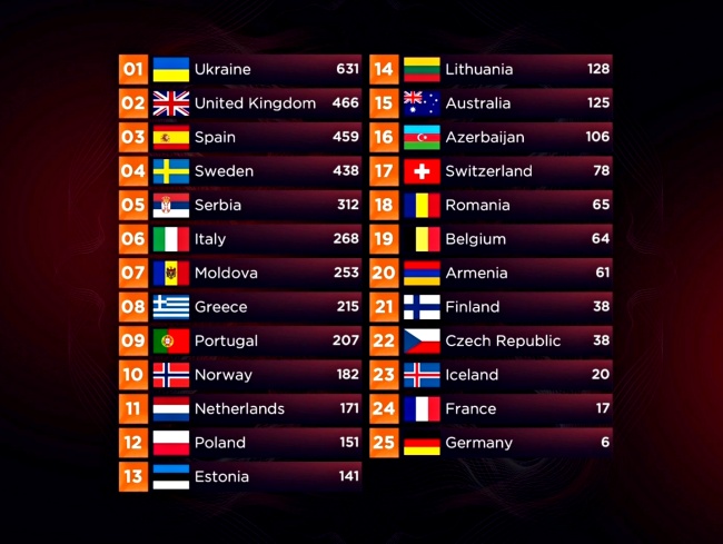I Kalush Orchestra si sono imposti con la loro ‘Stefania’, brano dedicato alla figura della madre, ribaltando la classifica grazie al voto el pubblico raccogliendo 631 punti. Blanco e Mahmood, che rappresentavano l’Italia con ‘Brividi’, hanno chiuso al sesto posto con 268 punti. Al secondo posto la Gran Bretagna (466), al terzo la Spagna (459). A chiudere la classifica delle 25 nazioni, la Germania con zero punti. La manifestazione quest’anno si è svolta a Torino, dopo la vittoria del 2021 dei Maneskin a Rotterdam. E proprio l’esibizione di Damiano, Victoria, Ethan e Thomas era tra i momenti più attesi della finalissima, che ha visto sfidarsi 25 artisti: i venti decretati dalle due semifinali più i 5 rappresentanti dei Big Five (Italia, Spagna, Germania, Regno Unito e Francia).