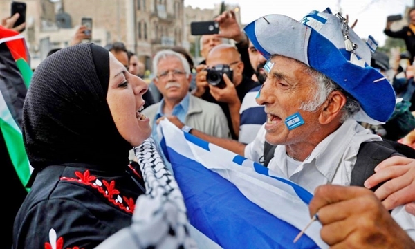 Un uomo israeliano discute animatamente con una donna palestinese a Gerusalemme. I due paesi continuano a vivere momenti di guerra con decine di vittime come quelle registrate negli ultimi giorni. Lo scontro s’è anche accentuato in occasione della nuova sede dell’ambasciata Usa inaugurata nei giorni scorsi a Gerusalemme.