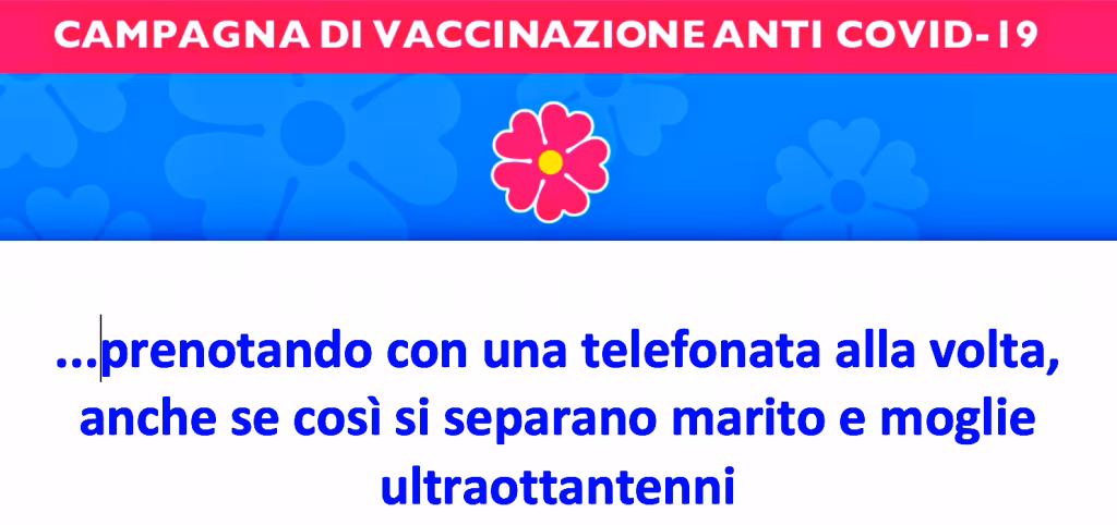 B. F. di 88 anni e la moglie A. devono prenotare il vaccino e lui, da bravo siciliano all’antica, prende in mano la situazione. Dai giornali sa che si può chiamare un numero verde (il computer non sa nemmeno accenderlo) e, da uomo d’esperienza, si organizza: telefono in viva voce, codici fiscali, documenti di identità; televisione, telecomando, “guantierina” con tazzina, cucchiaino, zucchero e moka fumante preparata da A. nella sua funzione di angelo dei fornelli, e via.
