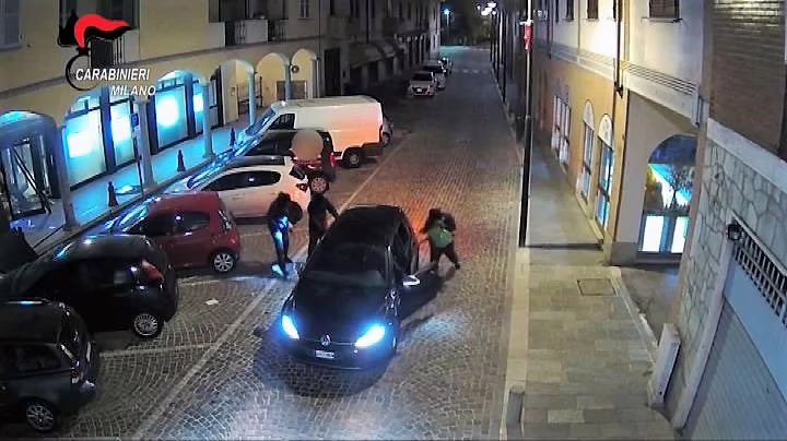 Circa tre minuti per far esplodere un bancomat con la tecnica della “marmotta”, un parallelepipedo in ferro riempito con una miscela esplosiva, infilato nella fessura da dove il congegno eroga le banconote. Queste immagini documentano l’assalto notturno alla filiale della Bpm di Solaro, in provincia del capoluogo lombardo, e la fuga dei banditi con il malloppo. Per questo e un altro colpo identico compiuto a Luisago, nel Comasco, mezz’ora più tardi, i carabinieri hanno arrestato quattro pregiudicati e un incensurato, tra i 26 e i 51 anni, tutti bolognesi. I militari del nucleo investigativo del Comando provinciale di Milano, li hanno bloccati in un garage mentre parcheggiavano l’auto immediatamente dopo aver compiuto le razzie. Recuperato l’intero bottino, 91.650 euro, i carabinieri proseguono le indagini per accertare eventuali altri furti compiuti dalla stessa banda.