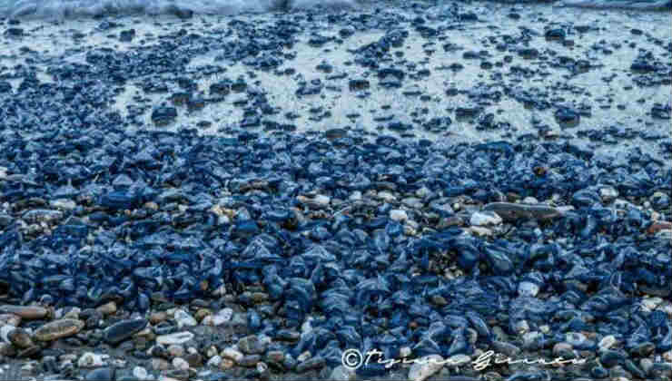 Le velelle, spesso confuse con meduse, sono in realtà parenti delle sifonofore. Si presentano come piccole formazioni ovali di colore blu intenso, con una caratteristica “vela” trasparente che sporge dalla superficie. Vivono in mare aperto, galleggiando e spostandosi grazie al vento e alle correnti. Quando le condizioni meteorologiche e marine le spingono verso le coste, possono spiaggiarsi in grandi quantità.