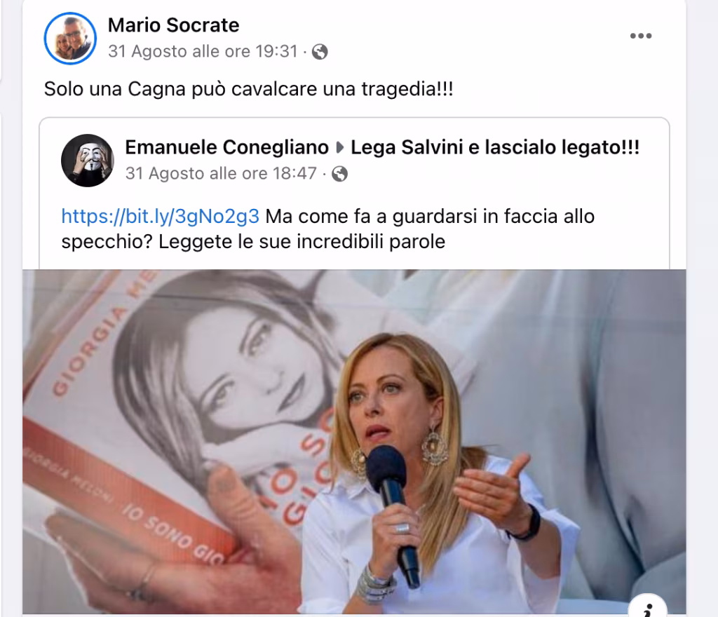“La solita ipocrisia della Cagna”, “Si allena un po` anche lei a stare a testa in giù”, “Lo posto dritto e poi si gira sempre a testa in giù”. Sono le frasi scritte su Facebook da un candidato del M5s alle Comunali di Busto Arsizio (Varese), Mario Socrate, riferite alla leader di Fdi, Giorgia Meloni. Lo ha denunciato in una nota il circolo cittadino di Fratelli d`Italia che definisce le parole usate dal pentastellato “inudibili in qualsiasi contesto civile” e si dice pronto ad azioni legali.
