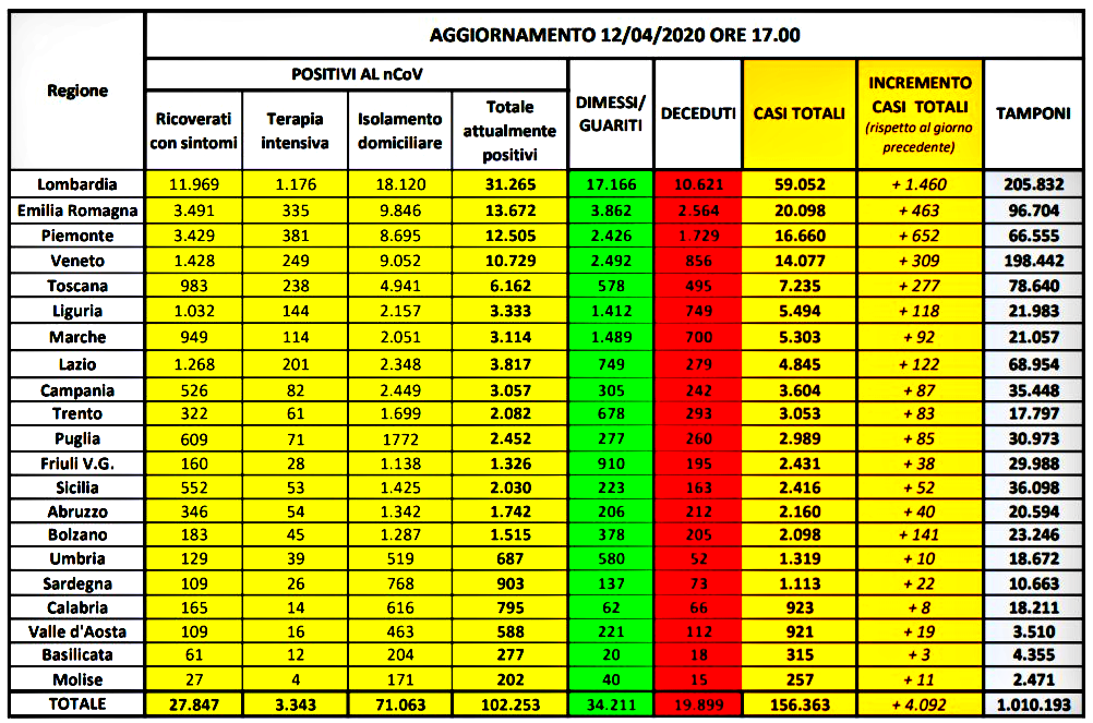 Dei 102.253 malati complessivi, 27.847 sono ricoverati con sintomi, 297 in meno rispetto a ieri – e 71.063 sono quelli in isolamento domiciliare. 34.211 le persone guarite, 1.677 più di ieri. Sabato l’aumento dei guariti era stato di 2.079. Sono invece 19.899 le vittime, con un aumento rispetto a ieri di 431. E’ l’incremento più basso dal 18 marzo. Ieri l’aumento era stato di 619. Il numero dei contagiati totali dal coronavirus in Italia – compresi morti e guariti – è di 156.363, con un incremento rispetto a ieri di 4.092.
