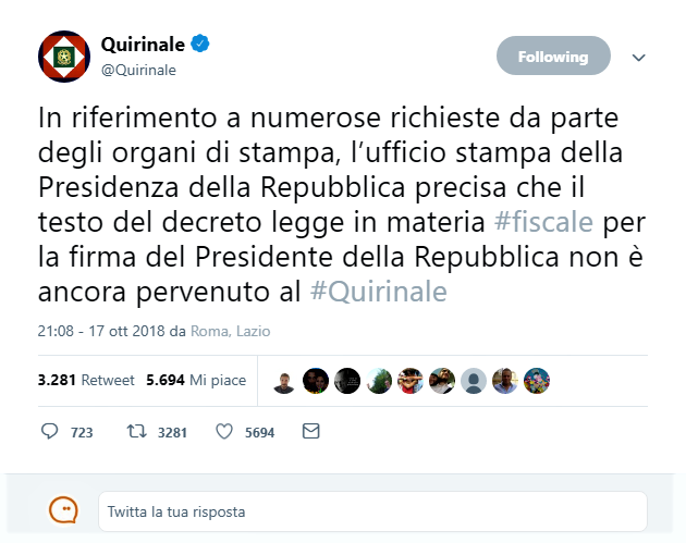 Il Colle, però, fa sapere che alla presidenza della Repubblica non è arrivato ancora alcun testo, mentre dai vertici della Lega si replica secco: “Siamo gente seria, non sappiamo niente di decreti truccati”. “Non ha mai detto – ha spiegato Di Maio – di voler aiutare i capitali mafiosi o parlato di esclusioni di punibilità per chi evade. Il testo trasmesso contiene la non punibilità. Al Quirinale è arrivato un testo non concordato in Cdm, con sia lo scudo per i capitali mafiosi sia la non punibilità per chi evade”.