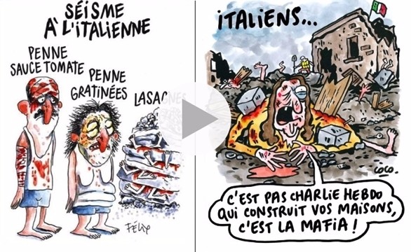 Nella vignetta si vedono un ferito insanguinato con la didascalia “Penne al pomodoro”, un’altra persona piena di lividi e ferite con quella “Penne gratinate” e infine quattro corpi sepolti da macerie con la scritta “Lasagne”. Sui social network naturalmente è esplosa l’indignazione e l’amletico dubbio: fino a che punto può arrivare la licenza di satira? Nella stessa ultima pagina della vignetta sul sisma, il drammatico tema della sciagura in Italia viene affrontato in un colonnino con una serie di battute: “circa 300 morti in un terremoto in Italia. Ancora non si sa che il sisma abbia gridato “Allah akbar” prima di tremare”. Sui social network decine di utenti hanno condannato la vignetta etichettandola come “agghiacciante”, “di cattivo gusto”, “immondizia” e “cattiva”, e la rabbia delle persone si moltiplica ora dopo ora. Per tutta risposta il settimanale satirico francese replica alle polemichecon una nuova vignetta: “Italiani… non è Charlie Hebdo che costruisce le vostre case, è la mafia”.