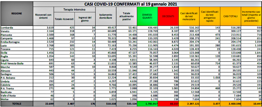 Sono 10.497 i nuovi casi e 603 le vittime registrate in Italia nelle ultime 24 ore. Ieri i nuovi casi erano stati 8825 e 377 i morti E’ quanto emerge dall’odierno bollettino del ministero della Salute-Iss. I test effettuati sono stati 254.070 (ieri 158.674). Il tasso di positività è oggi al 4,1%, ieri era del 5,6%. Con i 603 decessi avvenuti nelle ultime 24 ore in Italia, sale a 83.157 il numero dei morti da inizio pandemia Covid-19 in Italia. Oggi in Italia sono positive 535.524 persone. E a oggi sono guarite/dimesse 1.781.917 persone. Inoltre, dall’inizio pandemia, i contagiati totali sono stati 2.400.598. Con 1.641 è la Sicilia, per il secondo giorno consecutivo, la regione italiana con il numero più alto di nuovi casi. Segue il Lazio con 1100 e con 1034, l’Emilia Romagna. In tutte le altre regioni si registrano meno di mille nuovi casi. La Regione con l’incremento minore è la Valle d’Aosta con 34.