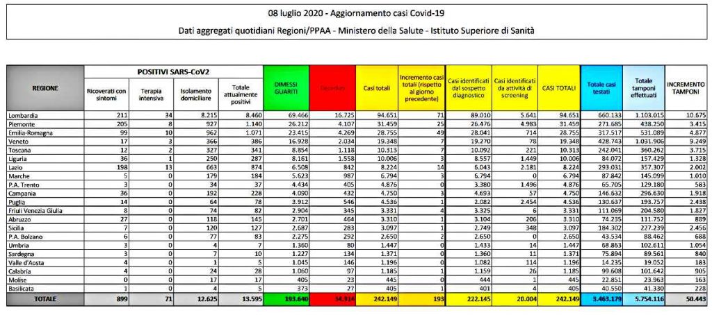 Sono 5 le regioni che oggi non registrano nessun nuovo caso. In particolare, rispetto a ieri, i positivi calano di 647 persone (-4,54%), i guariti aumentano di 825 (+0,43%), mentre i deceduti in più sono 15 (+0,04%). Sono 193 i “nuovi” casi totali (in più rispetto a ieri) di contagi da coronavirus in Italia. Di questi, 71 sono in Lombardia (il 36,79%), 49 in Emilia-Romagna (25,39%), 25 in Piemonte (12,95%) e 14 nel Lazio (7,25%): 159 casi, l’82,38%, in 4 Regioni. Sono 5 le regioni che oggi non registrano nessun nuovo caso (Provincia autonoma di Trento, Umbria, Sardegna, Valle d’Aosta, Molise). La Regione Lazio ha segnalato che al totale dei casi positivi si aggiunge un totale di 37 persone positive a test molecolare per la ricerca di SARS-CoV-2 identificate a seguito di screening effettuato allo sbarco del volo Dacca-Fiumicino atterrato il 6 giugno 2020 alle 17.45 presso l’aeroporto Leonardo da Vinci di Fiumicino, come da ordinanza regionale.