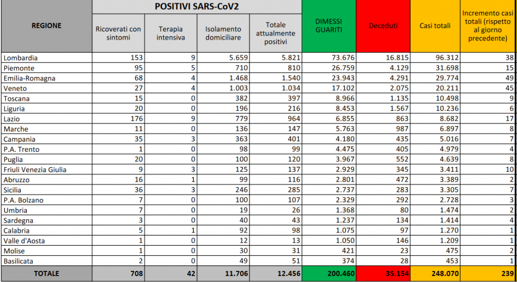 Sono 239 i nuovi casi di coronavirus registrati nell’odierno bollettino del ministero della Salute, che portano a 248.070 i casi totali dall’inizio della pandemia. Gli attualmente positivi sono 12.456, come ieri. I guariti salgono a 200.460, 231 in più rispetto a ieri, mentre gli 8 decessi registrati da ieri – tutti in Lombardia – hanno portato la cifra totale a 35.154. Oggi non ci sono regioni a zero contagi, visto che c’è un positivo registrato sia in Calabria che in Valle d’Aosta e in Basilicata. I tamponi effettuati sono stati 43.269, ben 17 mila circa meno di ieri. I ricoverati in terapia intensiva sono 42, uno in meno del giorno precedente. I ricoverati con sintomi sono 708, con un leggero incremento, +3, rispetto a ieri.