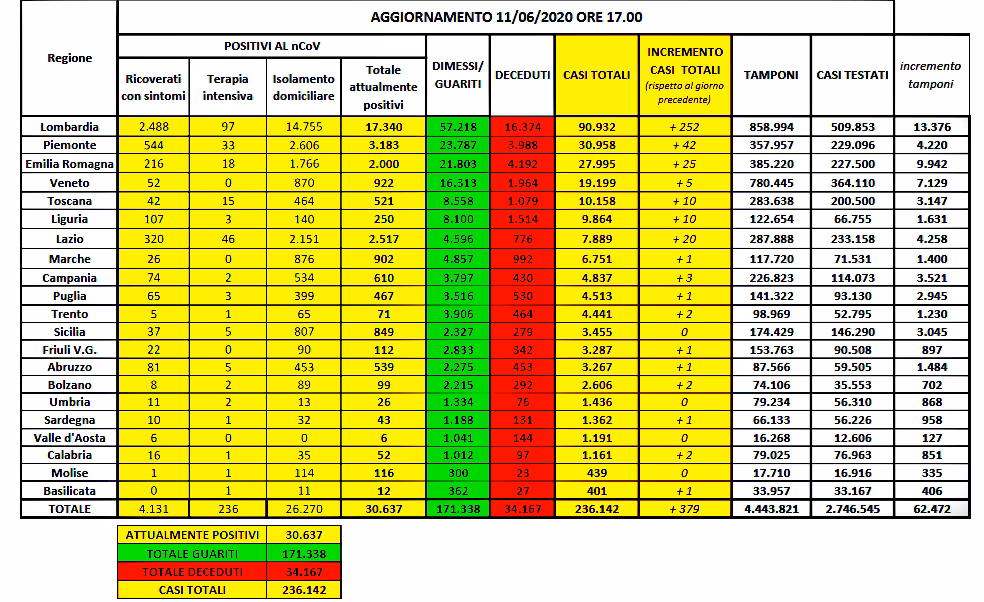 Il totale dei casi Covid-19 registrati in Italia è arrivato a 236.142. I nuovi casi odierni sono +379 (ieri erano +202). Ma c’è da sottolineare che 252, ovvero oltre il 66% dei nuovi positivi su scala nazionale sono in Lombardia. Tra le altre regioni più colpite, l’incremento è di 42 casi in Piemonte, 25 in Emilia Romagna, 5 in Veneto, 10 in Toscana, 10 in Liguria e 20 nel Lazio. I morti delle ultime 24 ore sono stati 53 (25 dei quali in Lombardia). In 10 Regioni non è stato registrato alcun decesso. In particolare, per la prima volta in Emilia Romagna (le altre sono Marche, Trentino Alto Adige, Abruzzo, Umbria, Sardegna, Valle d’Aosta, Calabria, Molise e Basilicata).