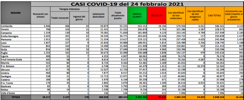 Aumentano ancora i contagi di Coronavirus in Italia, ma calano i morti. Secondo l’odierno bollettino del ministero della Salute-Iss, sono 16.424 i test positivi nelle ultime 24 ore, e 318 le vittime. Ieri i positivi erano stati 13.314 e i morti 356. I casi totali da inizio epidemia sono 2.848.564, i morti 96.666. Gli attualmente positivi sono 389.433 (+1.485 rispetto a ieri), i dimessi o guariti 2.362.465 (+14.599), in isolamento domiciliare ci sono ora 369.059 persone (+1.552).