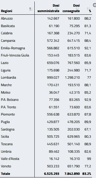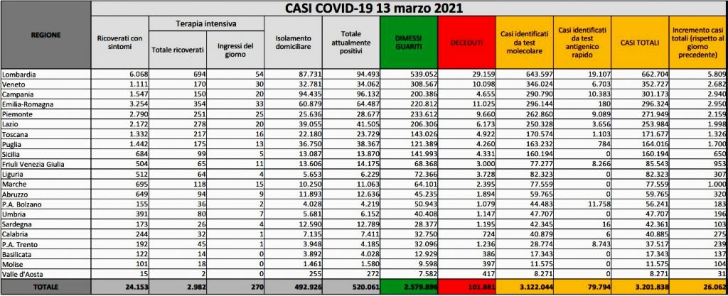 Il tasso di positività (rapporto positivi/test) odierno è del 6,98%%, ieri era stato del 7,2%, quindi in calo dello 0,2%. I casi totali da inizio epidemia sono 3.201.838, i morti 101.881. Gli attualmente positivi sono 520.061 (+10.744 rispetto a ieri), i dimessi e i guariti 2.579.896 (+14.970), in isolamento domiciliare ci sono 492.926 persone (+10.179). Sono 270 gli ingressi in terapia intensiva. Il saldo giornaliero tra ingressi e uscite è di 68 pazienti in più. In totale in rianimazione ci sono ora 2.982 persone. Nei reparti ordinari (pneumatologia e malattie infettive) sono invece aumentati i pazienti di 497 unità rispetto a ieri, portando il totale a 24.153.