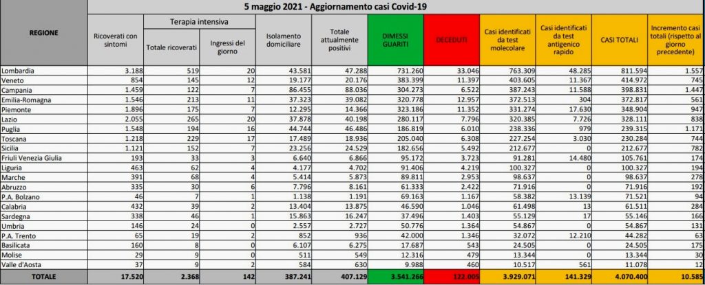Dati da tener presente in vista del nuovo monitoraggio dell’Iss previsto per venerdì e del conseguente cambio di colore delle Regioni. Restano intanto al centro del dibattito il il coprifuoco, con le Regioni che spingono per spostarlo alle 23, e il pass verde, il lasciapassare che consentirà di spostarsi non solo dall’Italia ma anche dentro il nostro Paese (fra regioni di colore diverso). Il passaporto vaccinale dovrebbe essere valido dal 15 maggio, come annunciato dal premier Draghi, e, anche in tema di vacanze estive, intanto è sul tavolo del commissario Figliuolo un piano per le Isole Covid Free. Le vaccinazioni, infine, tornano a scendere ben sotto quota 500 mila al giorno. In Italia somministrate 21.615.054 dosi di sieri anti Covid. Nuova circolare: richiamo Pfizer e Moderna dopo 42 giorni, sì a seconda dose AstraZeneca.