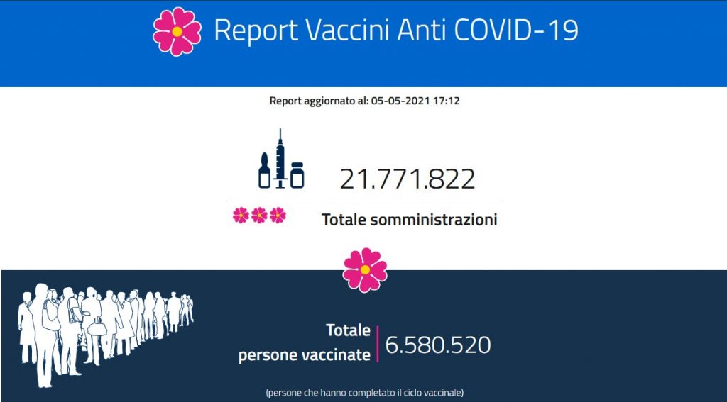 Dati da tener presente in vista del nuovo monitoraggio dell’Iss previsto per venerdì e del conseguente cambio di colore delle Regioni. Restano intanto al centro del dibattito il il coprifuoco, con le Regioni che spingono per spostarlo alle 23, e il pass verde, il lasciapassare che consentirà di spostarsi non solo dall’Italia ma anche dentro il nostro Paese (fra regioni di colore diverso). Il passaporto vaccinale dovrebbe essere valido dal 15 maggio, come annunciato dal premier Draghi, e, anche in tema di vacanze estive, intanto è sul tavolo del commissario Figliuolo un piano per le Isole Covid Free. Le vaccinazioni, infine, tornano a scendere ben sotto quota 500 mila al giorno. In Italia somministrate 21.615.054 dosi di sieri anti Covid. Nuova circolare: richiamo Pfizer e Moderna dopo 42 giorni, sì a seconda dose AstraZeneca.