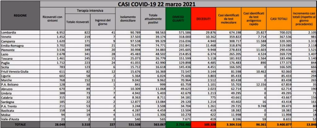 Sono 13.846 (20.159 ieri) i nuovi casi di Covid registrati in Italia nelle ultime 24 ore e 386 (ieri 300) i decessi. Il dato emerge dall’odierno bollettino del ministero della Salute-Iss che certifica che il tasso di positività è dell’8,1% contro il 7,27% di ieri. L’incremento dei tamponi effettuati è stato, invece, di 169.196. I casi totali di Covid nel nostro paese hanno, invece, ormai superato i 3 milioni e 400mila con un ingresso nelle terapie intensive nelle ultime 24 ore pari a 227 unità. Se ieri, infatti erano 3.448 oggi hanno raggiunto i 3.510 pazienti.
