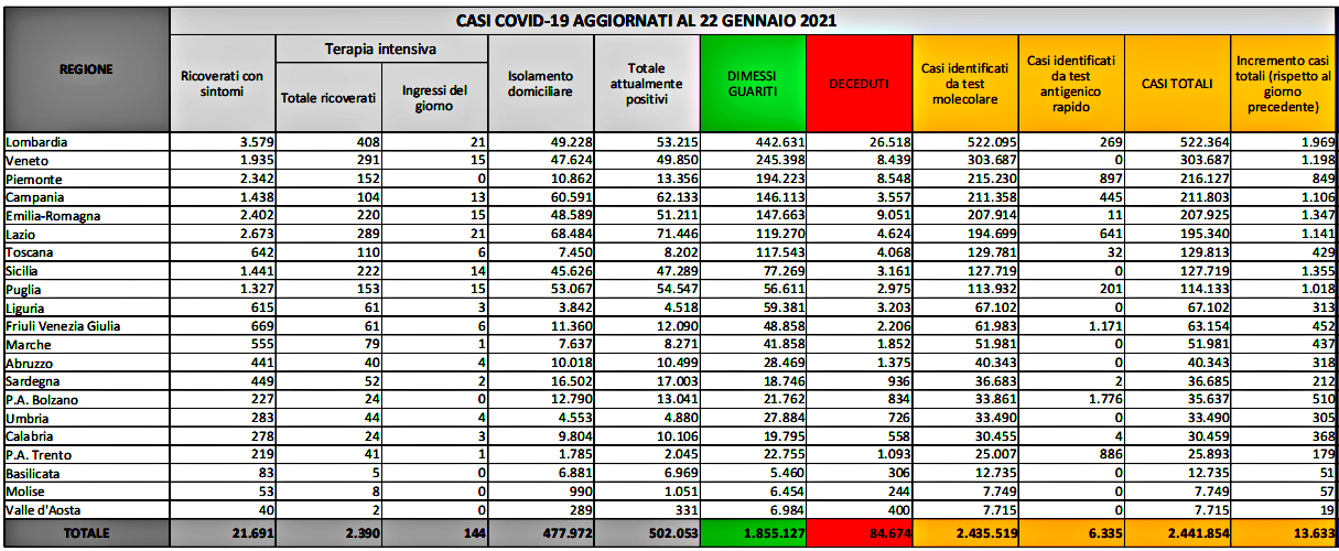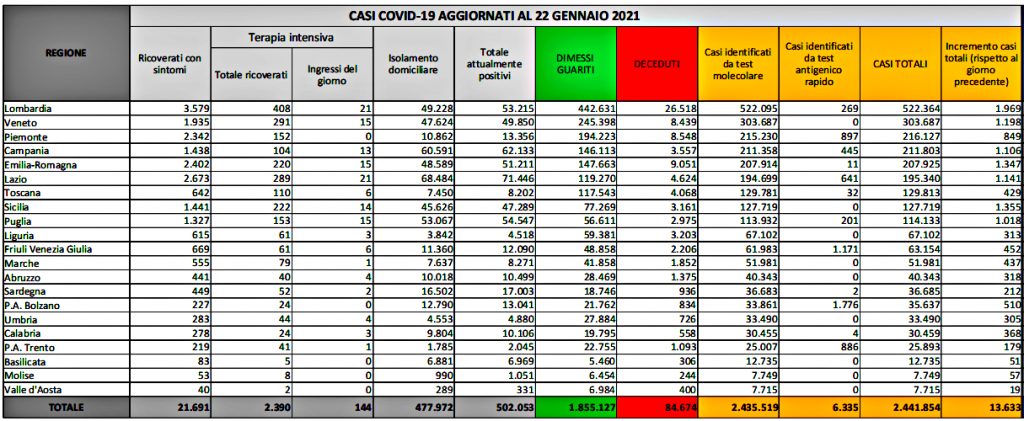 Cala il numero dei ricoveri di persone con sintomi Covid-19 negli ospedali italiani: 21.691, 355 meno di ieri, le Nelle terapie intensive invece si trovano oggi 2390 persone (-28). In isolamento domiciliare sono oggi 477.972 (-14.133) persone mentre quelle positive sono complessivamente 502.053 (-14.515). Con 1.969 anche oggi è la Lombardia la Regione nella quale è stato riscontrato il maggior numero di nuovi casi Covid-19. Segue la Sicilia con 1.355, quindi l’Emilia Romagna con 1.347, poi il Veneto con 1.198, il Lazio 1.141, la Campania con 1.106 e la Puglia con 1.018. Nelle rimanenti regioni si sono registrati meno di mille casi. La regione con l’incremento minore di casi è la Valle d’Aosta che segna +19.