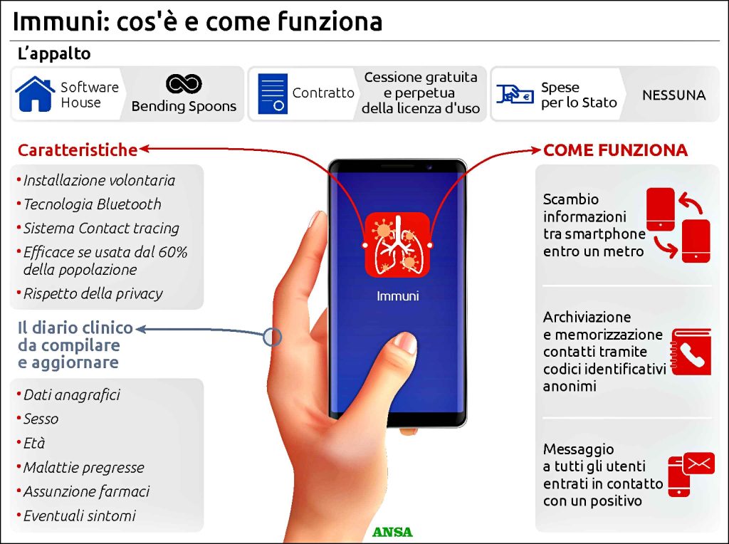 Ecco come funzionerà la App Immuni che sarà operativa da maggio, come ha spiegato il commissario straordinario per l’emergenza Covid-19 Domenico Arcuri, con le prime funzioni. Se il signor Rossi viene informato di aver avuto un contatto stretto per più di 15 minuti con il signor Bianchi che nel frattempo da un tampone ha scoperto di essere contagiato, Rossi è un pericolo per sé stesso, i suoi cari e chi incontra. È stato in contatto con un contagiato e non lo sa. La app lo avvisa subito e lo mette in condizioni di smettere di essere un pericolo, questo è il contact tracing. Poi la app acquisirà ulteriori funzionalità che riguarderanno il diario clinico e diventerà uno strumento che permetterà di governare la relazione tra il signor Rossi, il signor Bianchi e il Ssn se possibile da remoto e se possibile senza appesantirlo.