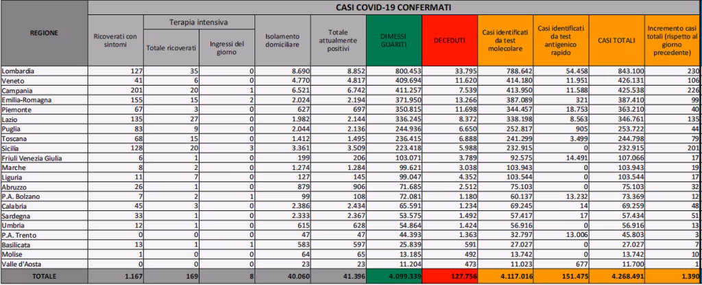 Sono 1.390 i nuovi casi di Covid registrati nelle ultime 24 ore in Italia, per 196.922 test tra molecolari e antigenici, mentre sono 24 i decessi. Il tasso di positività scende allo 0,7%, dallo 0,8% di ieri. Sono 169 le terapie intensive, ammontano a 1.167 i ricoveri ordinari. È quanto emerge dal bollettino quotidiano del ministero della Salute. Ieri i i casi erano stati leggermente superiori, 1.394 mentre i morti erano stati 13.