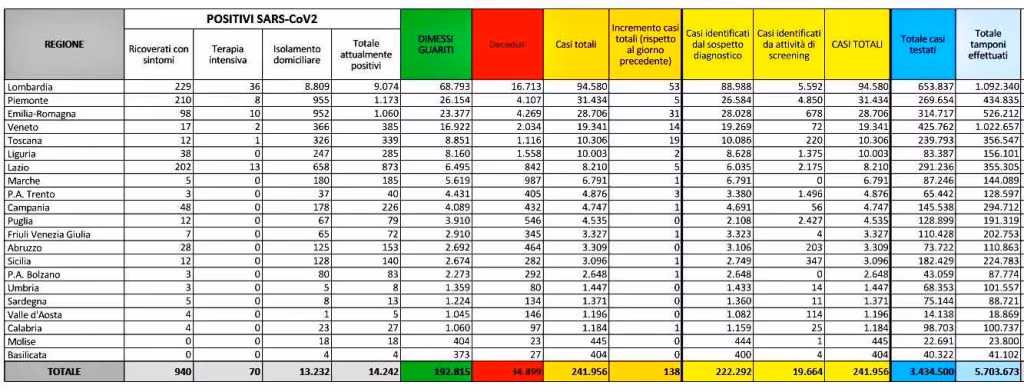 Buone notizie dal bollettino quotidiano del ministero della Salute. Cala la curva epidemica in Italia: 138 i nuovi casi registrati oggi, contro i 208 di ieri. Complice il forte calo della Lombardia, 53 positivi contro i 111 di 24 ore fa, a fronte però di meno tamponi. Il totale degli italiani colpiti dal Covid sale così a 241.956. Forte rialzo invece del numero dei decessi, 30 oggi contro gli 8 di ieri (e i 7 di domenica). Si sono registrate vittime in Lombardia (13), Veneto (10), Piemonte (3), Toscana (2), Emilia Romagna e Puglia (1 ciascuna). Il totale sale a 34.899. Aumentano i guariti, 574 in un giorno (ieri erano appena 133), che salgono a 192.815. Per effetto di questi dati, tornano a scendere dopo due giorni di aumento i malati attivi: 467 in meno rispetto a ieri, per un totale di 14.242.