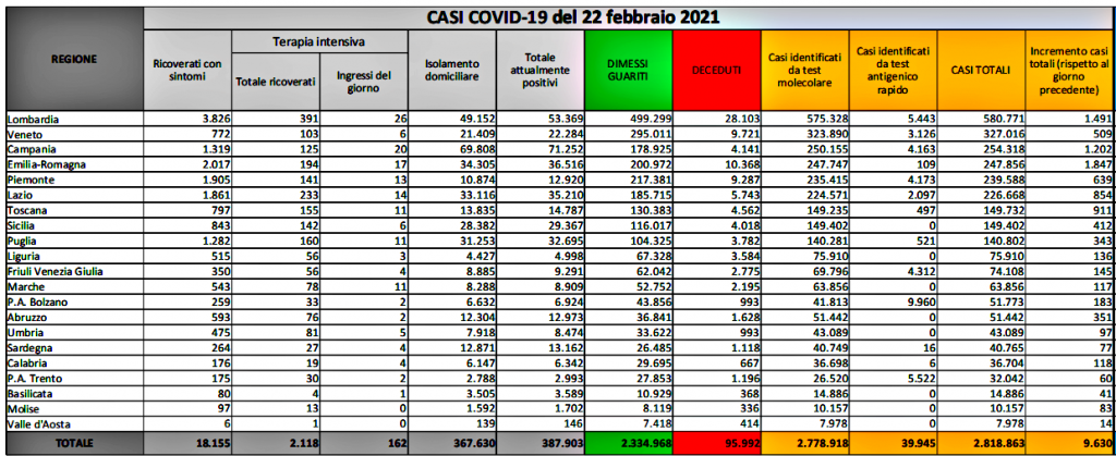 Il tasso di positività, a fronte di 170.672 tamponi, sale al 5,6%, con un incremento dello 0,3% rispetto al giorno precedente. In aumento anche i ricoveri: +351 nei reparti ordinari e +24 in terapia intensiva sul territorio nazionale. E così sono 2.118 le persone ricoverate in terapia intensive, mentre gli ingressi giornalieri in rianimazione sono stati 162. Nei reparti ordinari sono invece ricoverate 18.155 persone. I casi totali da inizio epidemia in Italia sono ora 2.818.863, i morti 95.992. Gli attualmente positivi tornano a scendere dopo due giorni di rialzo e sono 387.903 (-992 rispetto a ieri), i guariti e dimessi 2.334.968 (+10.335), in isolamento domiciliare ci sono ora 367.630 persone (-21.265). La regione con più nuovi casi è oggi l’Emilia-Romagna, seguita da Lombardia e Campania. Si tratta delle tre regioni con anche il maggior numero di tamponi eseguiti. I vaccini totali somministrati nel nostro Paese sono a oggi 3.537.975.
