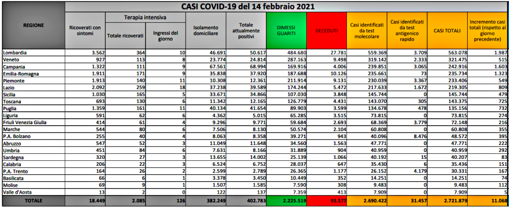 Sono 11.068 i nuovi casi di contagio da Covid-19, e 221 decessi, nelle ultime 24 ore in Italia. È quanto emerge dall’odierno bollettino del ministero della Salute-Iss. Ieri c’erano stati 13.532 nuovi casi e 311 vittime. A oggi il totale di contagiati da inizio pandemia è di 2.721.879, mentre quello delle vittime 93.577. Sono stati 205.642 i test (tamponi molecolari e antigenici rapidi), in calo di circa 85mila rispetto a ieri, quando ne sono stati fatti 290.534. Il tasso di positività sale al 5,3% (ieri era 4,6%).