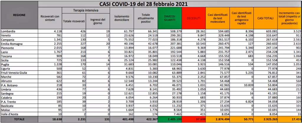 I nuovi casi di coronavirus registrati in Italia nelle ultime 24 ore sono 17.455, con 257.024 tamponi eseguiti. Flessione dei contagi rispetto a ieri, quando se ne contavano 18.916, ma con ben 323.047 tamponi, ovvero 66mila in più. È quanto emerge dall’odierno bollettino del ministero della Salute-Iss. Il tasso di positività si attesta al 6,8%, in aumento di un punto rispetto al 5,86% di ieri, sabato. Cala però il numero dei decessi, 192, contro i 280 del giorno precedente, per un totale di 97.699 morti dall’inizio della pandemia. Nuovo aumento degli attualmente positivi che oggi sono 10.401 in più (per un totale di 422.367 persone) mentre i guariti sono 6.847 (per un totale di 2.405.199)