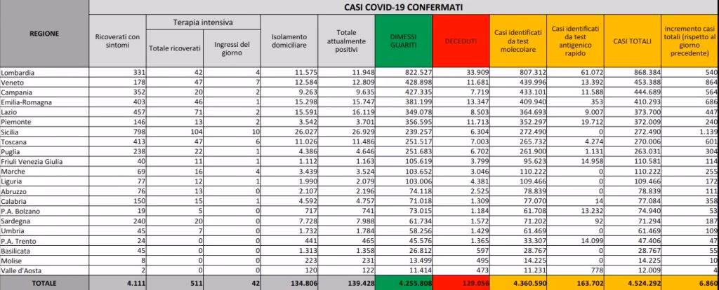 Quanto agli ospedali, i pazienti con sintomi ricoverati nei reparti ordinari sono 4.111, tre in meno; 511 quelli nelle terapie intensive, stabili rispetto a ieri nel saldo tra entrate e uscite. Dall’inizio della pandemia le vittime sono state 129.056, gli infettati 4.524.292. I dimessi e i guariti sono invece 4.255.808, con un incremento di 5.494 rispetto a ieri, mentre gli attuali positivi salgono a 139.428, con un incremento di 1.310 casi nelle ultime 24 ore.