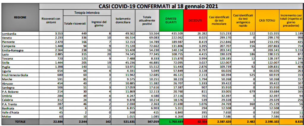 Sono complessivamente 39422 i casi positivi al Covid 19 registrati in Abruzzo dall’inizio dell’emergenza. Rispetto a ieri si registrano 107 nuovi casi (di età compresa tra 2 e 95 anni). I positivi con età inferiore ai 19 anni sono 10, di cui 4 in provincia dell’Aquila, 1 in provincia di Pescara, 4 in provincia di Chieti e 1 in provincia di Teramo. Il bilancio dei pazienti deceduti registra 8 nuovi casi e sale a 1333 (di età compresa tra 40 e 97 anni, 3 in provincia di Chieti, 4 in provincia di Teramo e 1 in provincia di Pescara). Del totale di oggi 2 casi sono riferiti ai giorni scorsi e comunicati solo oggi dalle Asl. Nel numero dei casi positivi sono compresi anche 26707 guariti (+269 rispetto a ieri). Gli attualmente positivi in Abruzzo sono 11382 (-170 rispetto a ieri). Dall’inizio dell’emergenza Coronavirus, sono stati eseguiti complessivamente 571413 tamponi molecolari (+6522 rispetto a ieri) e 7196 test antigenici (+5406 rispetto a ieri). E ancora: 454 pazienti (+11 rispetto a ieri) sono ricoverati in ospedale in terapia non intensiva; 43 (+5 rispetto a ieri con 7 nuovi ricoveri) in terapia intensiva, mentre gli altri 10885 (-186 rispetto a ieri) sono in isolamento domiciliare con sorveglianza attiva da parte delle Asl. Del totale dei casi positivi, 11757 sono residenti o domiciliati in provincia dell’Aquila (+16 rispetto a ieri), 8673 in provincia di Chieti (+41), 8090 in provincia di Pescara (+17), 10389 in provincia di Teramo (+30), 339 fuori regione (+3) e 174 (invariato) per i quali sono in corso verifiche sulla provenienza.