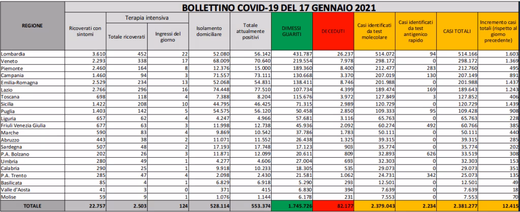 Sono in totale 12.415 i nuovi positivi oggi in Italia su 211.078 test eseguiti, tra tamponi antigenici e molecolari, mentre i decessi sono 377. E quanto emerge dall’odierno bollettino sull’emergenza coronavirus in Italia del ministero della Salute-Iss. Ieri 16.310 nuovi casi con 260.704 tamponi e 475 morti. Il tasso di positività crolla al 5,9% rispetto al 6,3% registrato ieri. I dimessi/guariti dagli ospedali sono stati, invece, 16.510, 27 i nuovi ricoverati con sintomi mentre risultano in totale 553.343 gli attualmente positivi con un più 4.343 casi. Il totale dei contagiati dall’inizio pandemia, sale a 2.381.277: i casi identificati da test antigenico rapido sono stati in totale 2.234 e 2.379.043 da test molecolari. Sono stati in totale 124 i nuovi ingressi nelle terapie intensive, portando il totale dei ricoverati in questi reparti ospedalieri a 2.503.