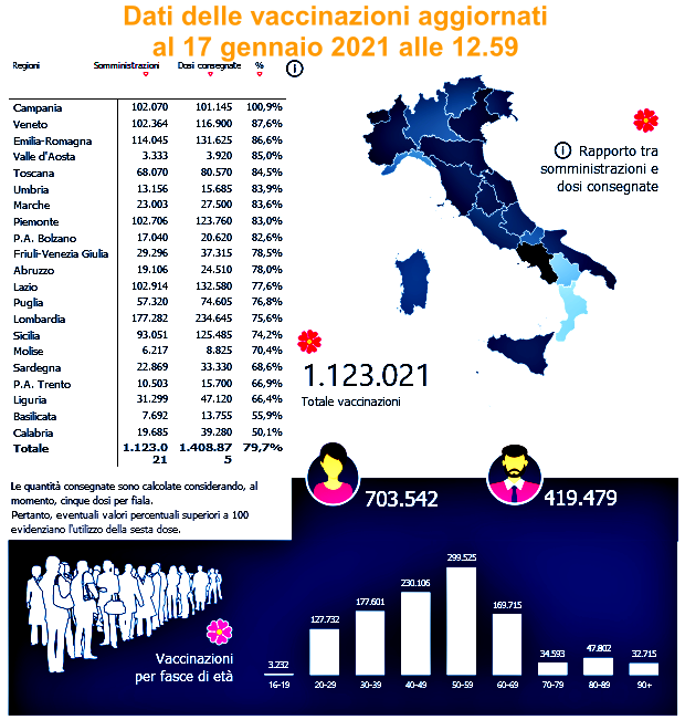 La Pfizer, si ricorda in una nota, ha comunicato, senza alcun preavviso, nel pomeriggio di venerdì 15 gennaio, che avrebbe unilateralmente ridotto le fiale destinate all`Italia nel corso della prossima settimana del 29%. La Pfizer ha altresì unilateralmente redistribuito le dosi da consegnare ai 293 punti di somministrazione sul territorio italiano. Di conseguenza, e in modo del tutto arbitrario, considerando che era già stato comunicato dal Commissario Straordinario alle Regioni che da lunedì 18 gennaio una fiala avrebbe contenuto 6 dosi di vaccino, come da recenti indicazioni di Ema e di AIFA, nella prossima settimana a fronte delle 562.770 dosi previste, verranno consegnate 397.800 dosi. Inoltre, l`arbitraria distribuzione decisa dall`azienda, non condivisa né comunicata agli uffici del Commissario, produrrà un`asimmetria tra le singole Regioni, con una differente riduzione delle consegne e con sei Regioni che non subiranno alcuna riduzione.