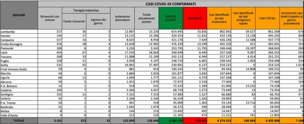 Sono 7.188 i nuovi casi di Sars-Cov-2 registrati in Italia nelle ultime 24 ore e 34 sono i morti. È quanto emerge dall’odierno bollettino del ministero della Salute- Istituto superiore di sanità. Dall’inizio della pandemia, sale a 4.435.008 il numero dei contagi mentre a 128.413 arriva il numero dei decessi. Ieri erano stati 7.409 i nuovi contagi e 45 i decessi. Gli attuali positivi al Sars-Cov-2 sono 126.466, con un incremento di 2.216 persone. I dimessi-guariti salgono a 4.180.129, con un incremento di 4.931.