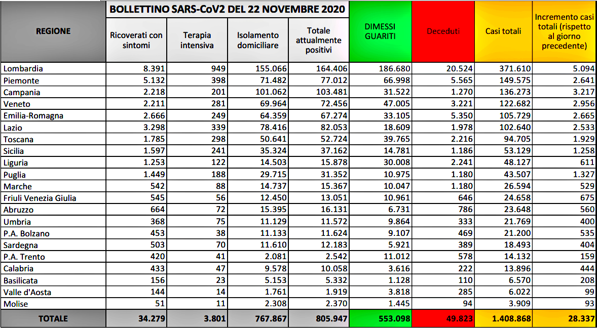Sono 28.337 i nuovi casi di coronavirus in Italia nelle ultime 24 ore, oltre 6.000 meno di ieri, precisamente 34.767. In calo anche le vittime in un giorno, pari a 562 contro le 692 di ieri. E’ quanto emerge dall’odierno bollettino del ministero della Salute sull’emergenza coronavirus. L’incremento degli attuali positivi è di 14.201, per un totale di 805.947. I pazienti dimessi sono stati 13.574. Il totale degli ospedalizzati è di 38.080 pazienti, con un aumento di 259 casi rispetto a ieri.