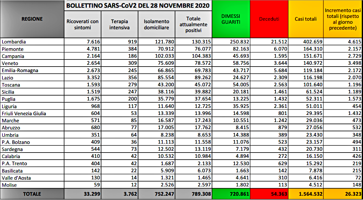 Sono 26.323 (28.352 ieri) i nuovi contagiati e 686 (827 ieri) i morti nelle ultime 24 ore in Italia, secondo l’odierno bollettino del ministero della Salute. Il rapporto tra tamponi e nuovi casi scende al 11.65%, contro il 12.73% di ieri. Il totale degli ospedalizzati in Italia è di 37.061 pazienti, con una diminuzione di 405 casi rispetto a ieri. Di questi, in terapia intensiva sono 3.762, con una diminuzione di 20 unità. In isolamento domiciliare si trovano 752.247 persone, 1.820 in più nelle ultime 24 ore. Il totale degli attualmente positivi in Italia è di 789.308, cioè 1.415 in più rispetto a ieri. Tra dimessi e guariti si contano 720.861 persone, in aumento di 24.214 unità. I deceduti sono 686 nelle ultime 24 ore per un totale nazionale di 54.363 vittime del Covid-19 dall’inizio della pandemia in Italia. I casi totali sono 1.564.532 (+26.323). I tamponi nelle ultime 24 ore sono stati 225.940 per un totale di 21.637.641 mentre ieri 222.803 . Le regioni con il maggior numero di nuovi casi sono Lombardia (+4.615), Veneto (+3.498), Campania (+2.729), Emilia-Romagna (+2.172), Piemonte (+2.157) e Lazio (+2.070).