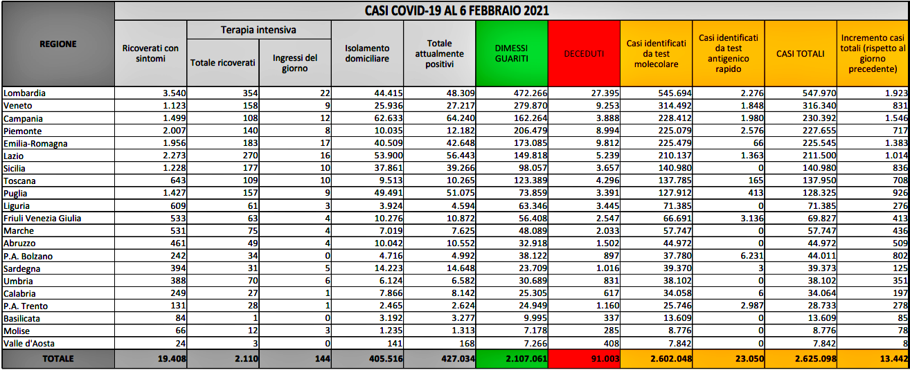 Sono 13.442 i nuovi casi di Covid-19 registrati nelle ultime 24 ore in Italia e 385 sono le vittime. È quanto emerge dall’odierno bollettino del ministero della Salute-Iss. Gli attualmente positivi sono 427.034: 405.516 si trovano in isolamento domiciliare, 19.408 sono ricoverati con sintomi, 2.110 si trovano in terapia intensiva (144 in più da ieri).