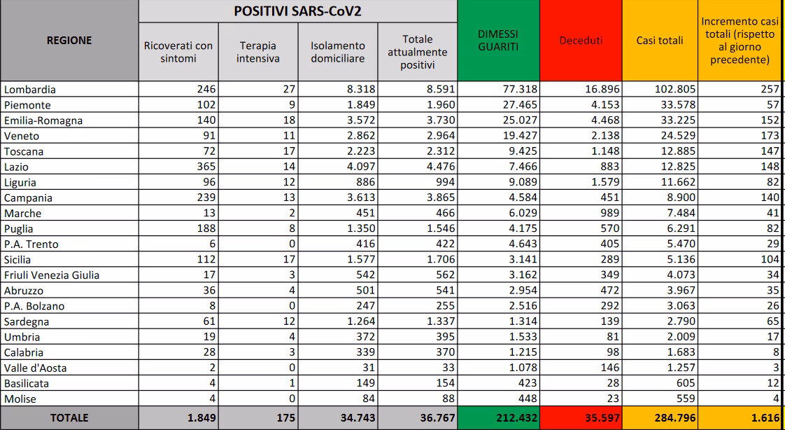 Grazie al sospetto diagnostico sono stati individuati 235.322 positivi al Covid-19 mente le attività di screening ne hanno scoperti fino ad oggi 49.474. Sale, rispetto a ieri, il numero delle persone ricoverate negli ospedali italiani: oggi sono 1849 (ieri 1836). Aumenta pure il numero dei ricoverati in terapia intensiva: oggi sono 175 mentre ieri erano 164. In salita di quasi mille unità anche il numero di quanti si trovano in isolamento domiciliare: 34.743 mentre 24 ore prima il dato era 33.708.  In tutte le regioni della penisola si sono registrati nuovi casi di positività nelle ultime 24 ore. Dei 1616 nuovi casi, 257 si registrano in Lombardia, 173 in Veneto, 152 in Emilia Romagna, 148 nel Lazio, 147 in Toscana, 140 in Campania e 104 in Sicilia. Nelle altre regioni i casi sono di molto sotto i cento. in aggiornamento