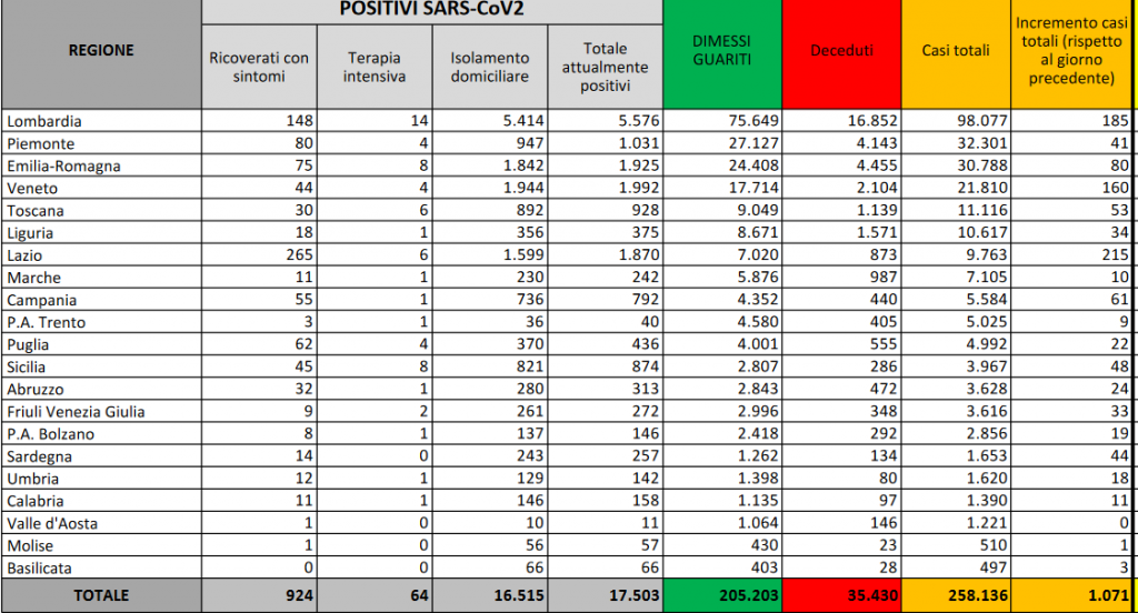 Continua l’aumento dei nuovi casi di coronavirus in Italia: 1.071 nelle ultime 24 ore, secondo il bollettino odierno del ministero della salute. Ieri l’aumento era stato di 947 casi. Oltrepassata così oggi quota mille di incremento giornaliero e raggiunto il numero totale, dall’inizio dell’epidemia, di 258.136. I deceduti, invece, oggi sono tre, ieri erano stati 9. La quota totale dei deceduti a causa della Covid-19 in Italia sale quindi a quota 35.430. I tamponi fatti in Italia nelle ultime 24 ore sono 77.674, che hanno portato alla scoperta di 1.071 nuovi casi di coronavirus, sono 5.678 test in più rispetto a ieri. Ieri infatti i tamponi sono stati 71.996 per 947 nuovi casi individuati. In totale i casi testati in Italia sono 4.692.505 con un totale di tamponi di 7.940.266. Su un totale di 258.136 casi di coronavirus dall’inizio dell’epidemia, i casi individuati da sospetto diagnostico sono 226.320, mentre 31.816 i casi individuati da screening.
