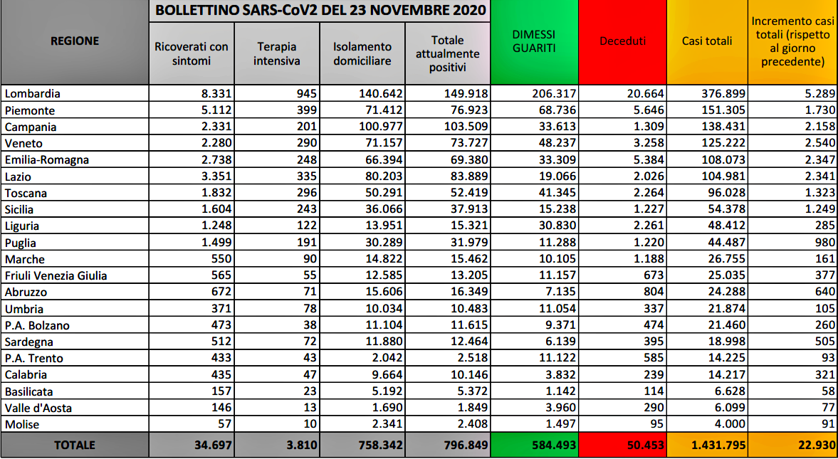 Sono 22.930 i nuovi casi di Sars-Cov-2 registrati in Italia nelle ultime 24 ore (-5.407 rispetto all’incremento di ieri), che portano il totale dei contagi dall’inizio della pandemia a 1.431.795. I tamponi fatti nelle ultime 24 ore sono 148.945, -39.802 rispetto a ieri. I morti sono 630 in 24 ore, +68 rispetto a ieri, e il numero dei deceduti per Covid-19 da inizio pandemia supera quota 50mila: il totale dei decessi è 50.453. E’ quanto emerge dall’odierno bollettibo del ministero della Salute.