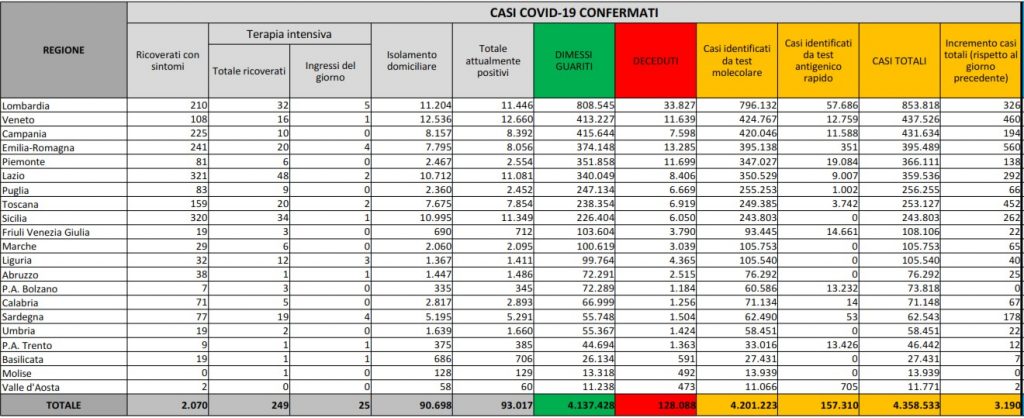 Continuano a crescere vittime e ricoveri. Sono 3.190 i nuovi di casi di Covid-19 in Italia nelle ultime 24 ore e 23 i morti. È in apparente calo il numero dei nuovi contagiati ma a fronte di metà numero di tamponi processati rispetto a ieri, solo 83.223 (ieri 167.761), come di consueto accade al lunedì. È quanto emerge dall’odierno bollettino del ministero della Salute che riporta anche il totale delle vittime 128.088 e dei contagiati 4.358.533 da inizio pandemia. Ieri i nuovi casi erano stati 5.321 mentre i morti 5. Come detto, tornano a salire i decessi Covid nel nostro Paese che vede oggi 20 vittime (+ 3 del Veneto dei giorni scorsi, ma registrati solo ieri) contro le 2 di ieri. Sale anche il tasso di positività al 3,8% contro il 3,2% di ieri.