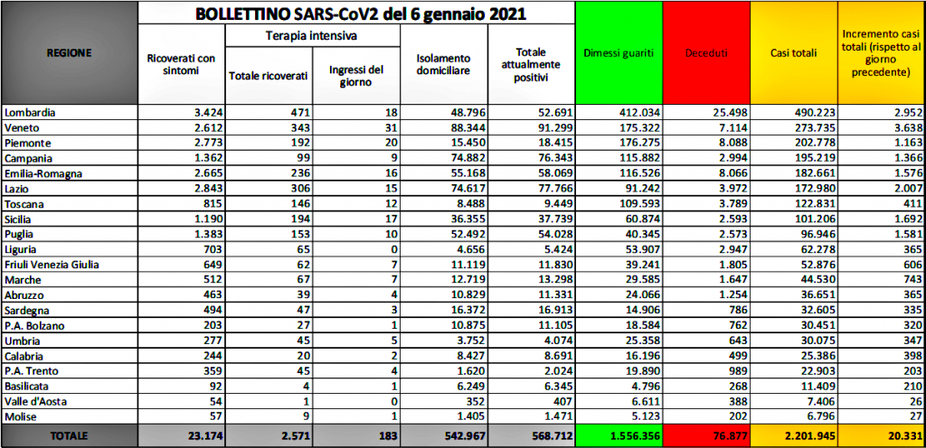 Sono in aumento di due unità i pazienti in terapia intensiva per il Covid-19 in Italia, nel saldo quotidiano tra ingressi e uscite. Gli ingressi giornalieri in rianimazione sono 183: il totale dei ricoverati in terapia intensiva è ora di 2.571. Dai reparti ordinari sono invece usciti 221 pazienti nelle ultime 24 ore, portando il totale a 23.174. Gli attualmente positivi sono 568.712, in calo rispetto a ieri (-449). I guariti di oggi sono 20.227 per un totale di 1.556.356.