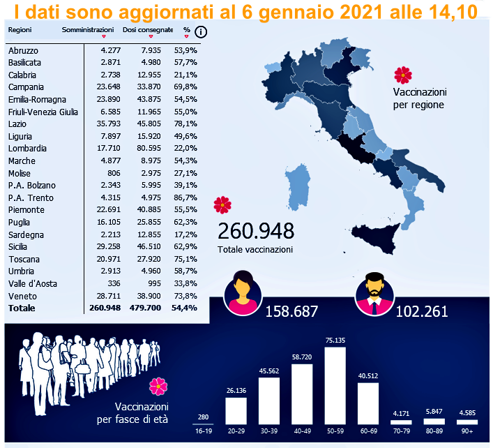 Il Commissario per l’Emergenza, Domenico Arcuri, fa sapere che al momento è stato presentato un programma con 5,9 milioni di vaccinati entro fine marzo, 13,7 ad aprile, 21,5 milioni entro fine maggio e si può completare la vaccinazione volontaria entro agosto. Inoltre, per la somministrazione del vaccino Pfizer (modello Freeze) il Commissario per l’Emergenza, invierà da subito 1.500 operatori tra medici e infermieri, a integrazione dei 3.800 già operativi nelle singole regioni. La suddivisione sarà in base alla popolazione. Entro il 7 gennaio sarà comunicato l’elenco del personale individuato per regione alla Agenzie per il lavoro (sono 5 divise per aree territoriali, in base al numero di popolazione) e a partire dal 20 i primi candidati saranno disponibili.
