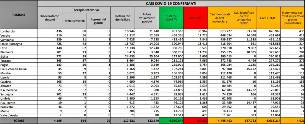 Sono 4.021 i nuovi casi di coronavirus in Italia (ieri 2.800), mentre i decessi odierni sono 72 (ieri 36), conteggiando i 20 decessi pregressi della Sicilia e i tre della Campania. È quanto emerge dal bollettino odierno del ministero della Salute. Dall’inizio dell’epidemia, comprese quelle guarite e quelle decedute, il numero di persone che hanno contratto il virus Sars-CoV-2 è pari a 4.613.214. Sul fronte dei decessi, da febbraio 2020 il totale delle vittime è pari a 130.027. Sono invece complessivamente 4.360.847 le persone guarite o dimesse, mentre gli attuali positivi sono in tutto 122.340, -3.564 rispetto a ieri (-1.430 il giorno prima).