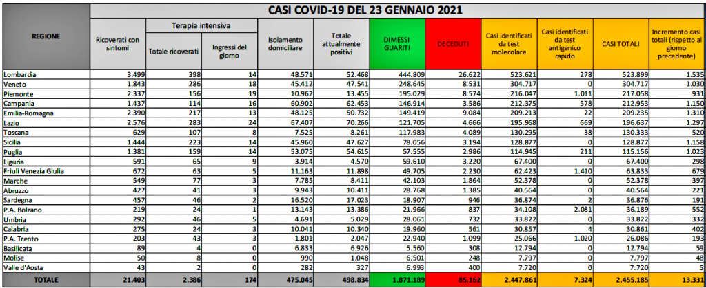 Sono 13.331 i nuovi casi d’infezione da Sars-Cov-2 in Italia rilevati nelle ultime 24 ore, che porta il totale a 2.455.185 dall’inizio della pandemia. Le persone che hanno perso la vita, invece, sono 488, portando il totale dall’inizio della pandemia a 85.162 vittime. In pratica, +16 morti rispetto ieri quando il bollettino segnava 472 vittime. E’ quanto emerge dall’odierno bollettino del ministero della Salute-Iss. Ieri i nuovi casi Covid-19 erano stati 13.633 e 472 i decessi. I tamponi totali, sia molecolari che antigenici rapidi processati nelle ultime 24 ore, sono 286.331, ovvero 21.603 in più rispetto a ieri. Nelle ultime 24 ore sono stati registrati 286.331 tamponi a fronte di 13.331 nuovi casi d’infezione (-302 rispetto all’incremento di ieri), con un tasso di positività che scende quindi al 4,66% (-0,44%). Ieri, infatti, erano stati processati 264.728 tamponi in totale a fronte di 13.633 nuovi casi, con un tasso di positività al 5,1%.