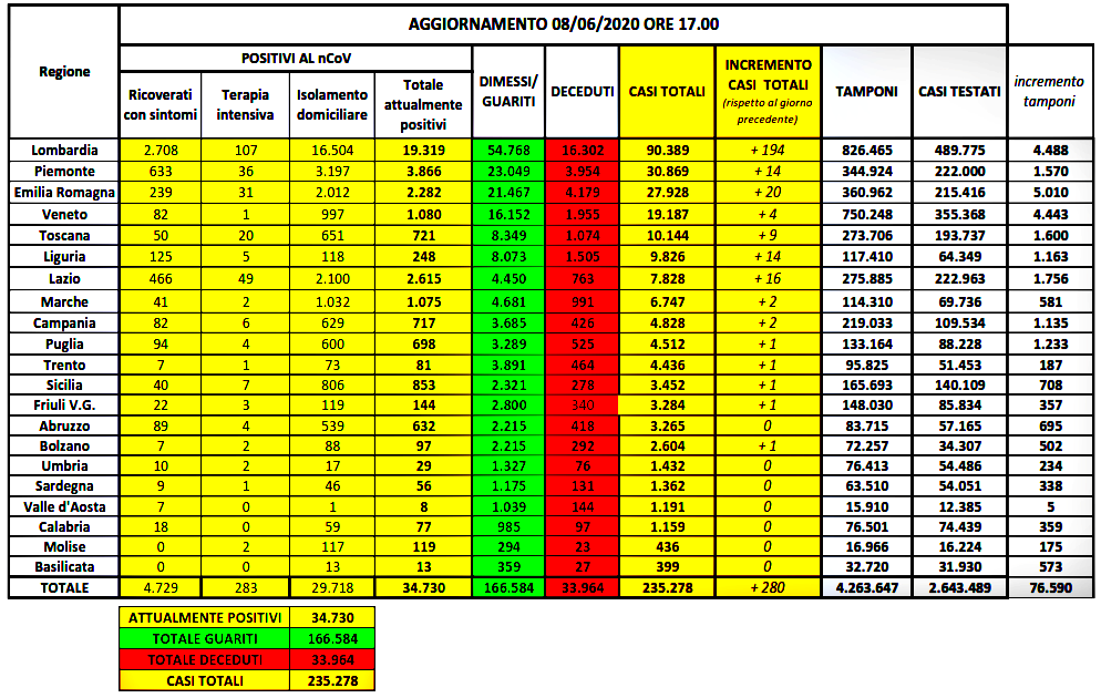 - Totale casi: 235.278 (+280, +0,12%)