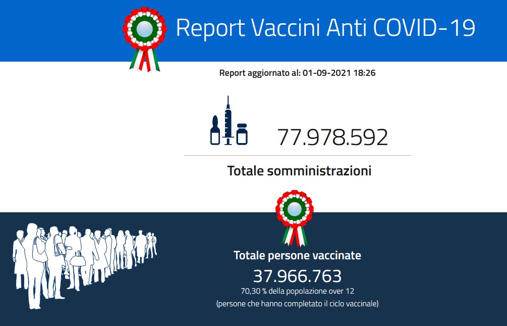 Crescono i nuovi casi, scendono leggermente invece i morti, che però restano sempre attorno a quota 70 e diminuiscono ancora i ricoveri ordinari e le terapie intensive. Oggi è il primo settembre, data clou in ottica Green pass: la certificazione verde diventa obbligatoria per usufruire dei trasporti a lunga percorrenza, per i docenti e collaboratori scolastici (qui il caso dei due docenti di Torino respinti dal preside) e per gli studenti universitari.