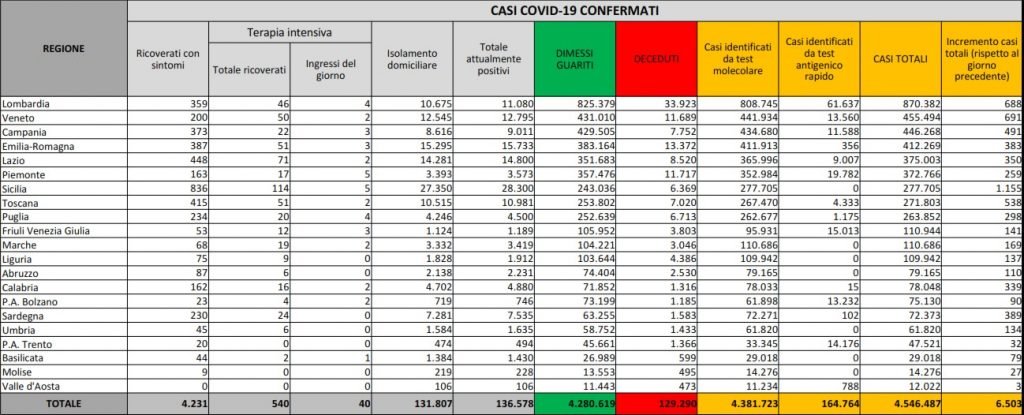 In cifre, secondo l’odierno bollettino del ministero della Salute, sono 6.503 i nuovi casi (totale 4.546.487) e 69 i morti (totale 129.290). Ieri, i nuovi contagiati erano stati 5.498 e le vittime 75. Con 303.717 i tamponi effettuati, 4mila in meno rispetto ai 307.643 di ieri il tasso di positività sale al 2,14% (ieri 1,78%). È in leggero allentamento la pressione ospedaliera: i ricoverati con sintomi sono 4.231, con una diminuzione di 21 unità rispetto a ieri, mentre i pazienti in terapia intensiva 540 (quattro in meno), con 40 ingressi del giorno (ieri erano stati 49).Si registrano -1.347 attuali positivi (totale 136.578), 7.774 dimessi/guariti (totale 4.280.619) e sono 131.807 le persone in isolamento domiciliare.