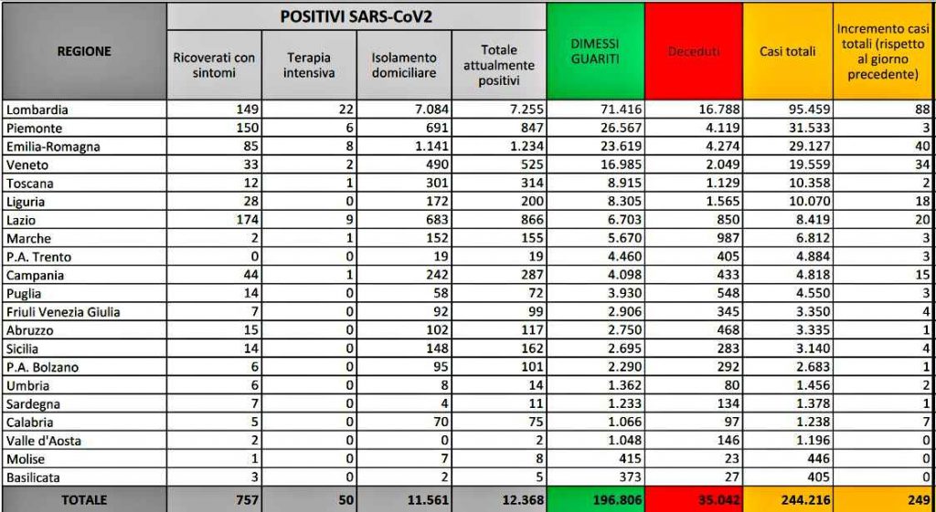 Sono 249 i nuovi casi di persone contagiati dal Coronavirus in Italia il cui totale è di 244.216. E’ quanto riporta il bollettino quotidiano della Protezione Civile nazionale, sottolineando che i decessi sono stati 14 di cui 10 in Lombardia, portando il totale a 35.042. I pazienti in terapia intensiva sono 50, come ieri, i ricoverati con sintomi sono 757 (-14), quelli in isolamento domiciliare sono 11.561 (-74). I tamponi nelle ultime 24 ore sono stati 48.265, in diminuzione rispetto a ieri. I nuovi positivi per il Covid sono 88 in Lombardia, 40 in Emilia Romagna, 88 in Veneto, 20 nel Lazio, 18 in Liguria e 15 in Campania, le altre regioni hanno incrementi a una sola cifra, tranne Valle d’Aosta, Molise e Basilicata che non registrano alcun nuovo caso. Complessivamente sono attualmente positive in Italia, 12.368 persone.