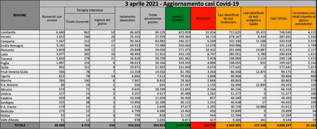 Sono 21.261 i nuovi casi di positività al Covid 19 registrati nelle ultime 24 ore in Italia e 376 nuovi decessi, che porta il totale ufficiale a 110.704 morti. È quanto emerge dall’odierno bollettino del ministero della Salute-Iss. Ieri erano stati 21.932 i nuovi positivi, e le vittime 481.