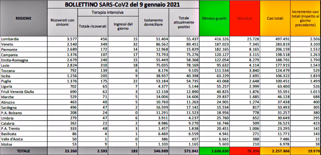 Sono 19.978 i casi di Covid-19 registrati nelle ultime 24 ore in Italia mentre 483 sono le vittime. E’ quanto emerge dall’odierno bollettino sull’emergenza coronavirus del ministero della Salute-Iss. Ieri c’erano stati 17.533 nuovi casi su 140.267 tamponi effettuati, 620 i morti. Sono 17.040 i guariti e 172.119 i tamponi effettuati con un tasso di positività a 11,6% (-0,9%). A oggi gli attualmente positivi in Italia sono 572.842. Di questi, 546.989 si trovano in isolamento domiciliare, 2.593 sono ricoverati con sintomi. I pazienti in terapia intensiva sono 183, più 6 rispetto a ieri.