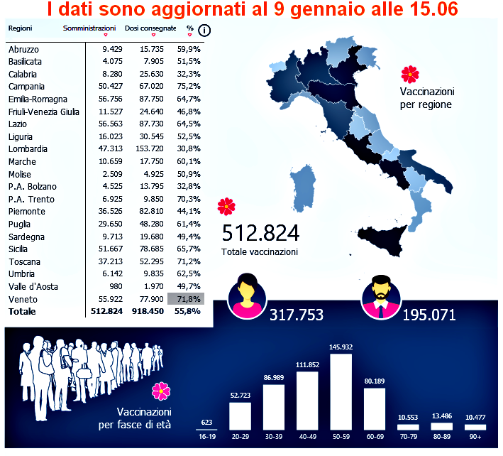 Su scala nazionale la somministrazione dei vaccini disponibili nel nostro Paese per il Covid-19 è arrivata, nella giornata dell’8 gennaio, al 54,6% delle dosi consegnate: 501.683 su 918.450. In particolare, nel dettaglio delle regioni, le percentuali più alte si registrano, secondo i dati diffusi dalla Presidenza del Consiglio dei ministri, in Campania (74,5%), Veneto (71,8%) e Toscana (71,2%). Proporzionalmente alle quantità ricevute, invece, le regioni che hanno effettuato meno vaccini sono il Piemonte (44,1%), la provincia autonoma di Bolzano (30%) e la Lombardia, ancora ultima in classifica, con il 29,7% delle dosi somministrate. In valori assoluti, invece, è il Lazio la regione con il maggior numero di somministrazioni (56.338), seguita dal Veneto (55.922) e dall’Emilia-Romagna (52.163).