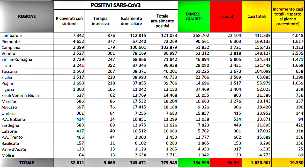 Sono 19.350 (16.377 ieri) in nuovi casi di Coronavirus registrati nelle ultime 24 ore in Italia dove sono stati effettuati 182.100 tamponi, portando il dato complessivo da inizio pandemia a 22.127.199 tamponi. E’ quanto emerge dall’odierno bollettino sullemergenza coronavirus del ministero della Salute-Iss. Registrati anche 785 (672 ieri)decessi, sale così a 56.361 il numero complessivo dei morti da inizio pandemia. Sono 32.811 (-376 rispetto a ieri) le persone ricoverate con sintomi negli ospedali italiani. Nelle terapie intensive si trovano oggi 3.663 (-81 rispetto a ieri) le persone ricoverate nelle terapie intensive. Sono 743.471 (- 8069 rispetto a ieri) le persone in isolamento domiciliare. Attualmente sono positive 779.945 persone (-8526 rispetto a ieri).